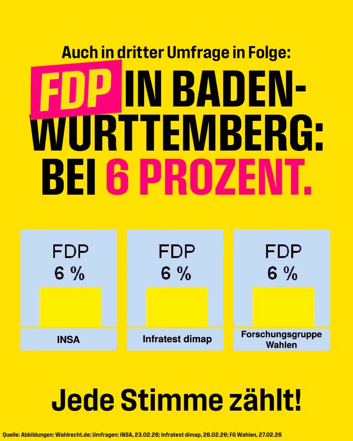 Drei Mal in Folge sechs Prozent für Hans-Ulrich Rülke und die FDP Baden-Württemberg eine Woche vor der Landtagswahl. 🔥🔥🔥 Jetzt noch einmal alles geben für den Politikwechsel am 8. März. 💪