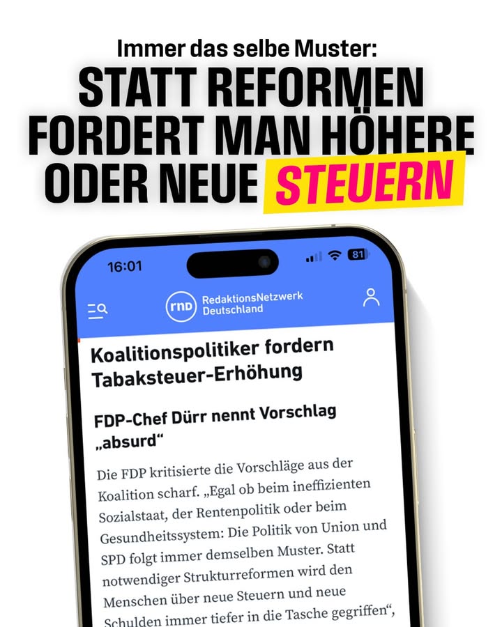 \@ChristianDürr: „Egal ob beim ineffizienten Sozialstaat, der Rentenpolitik oder beim Gesundheitssystem: Die Politik von Union und SPD folgt immer demselben Muster. Statt notwendiger Strukturreformen wird den Menschen über neue Steuern und neue Schulden immer tiefer in die Tasche gegriffen. Die jetzige Diskussion über Steuererhöhungen zur Finanzierung der Krankenkassen ist absurd. Steuererhöhungen ändern nichts an den Problemen sondern decken sie allenfalls eine zeitlang zu. Die Krankenkassen können nur mit echten Reformen langfristig stabil aufgestellt werden: mehr Eigenverantwortung mit Beitragsrückerstattung, wenn man nicht zum Arzt geht, und der Einstieg in eine Kapitaldeckung, damit die Kassen Rücklagen bilden können.“