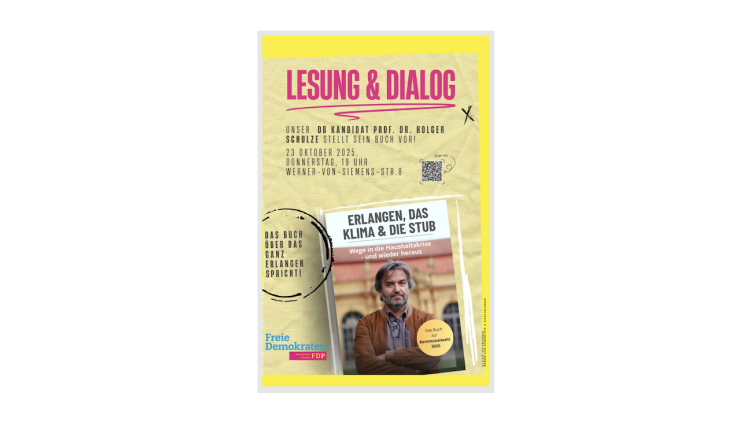 Der Erlanger FDP-Oberbürgermeisterkandidat, Prof. Dr. Holger Schulze, lädt Sie herzlich zu einer Lesung aus seinem Buch ein, in dem er die Ursachen der Haushaltskrise Erlangens und deren Zusammenhang mit dem Klimanotstand und der StUB beschreibt. Auch erläutert er, wie er die Finanzlage der Stadt als zukünftiger Oberbürgermeister verbessern würde.